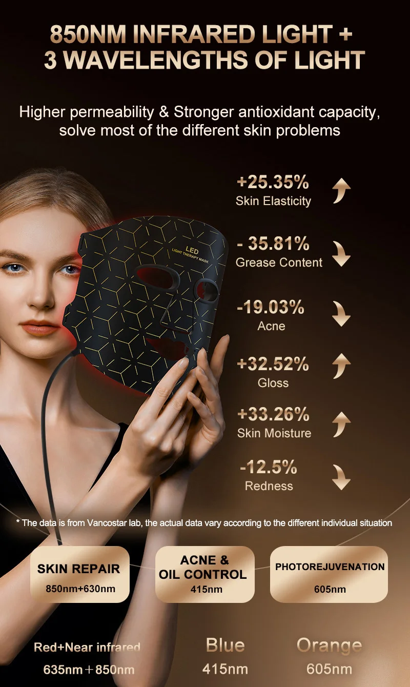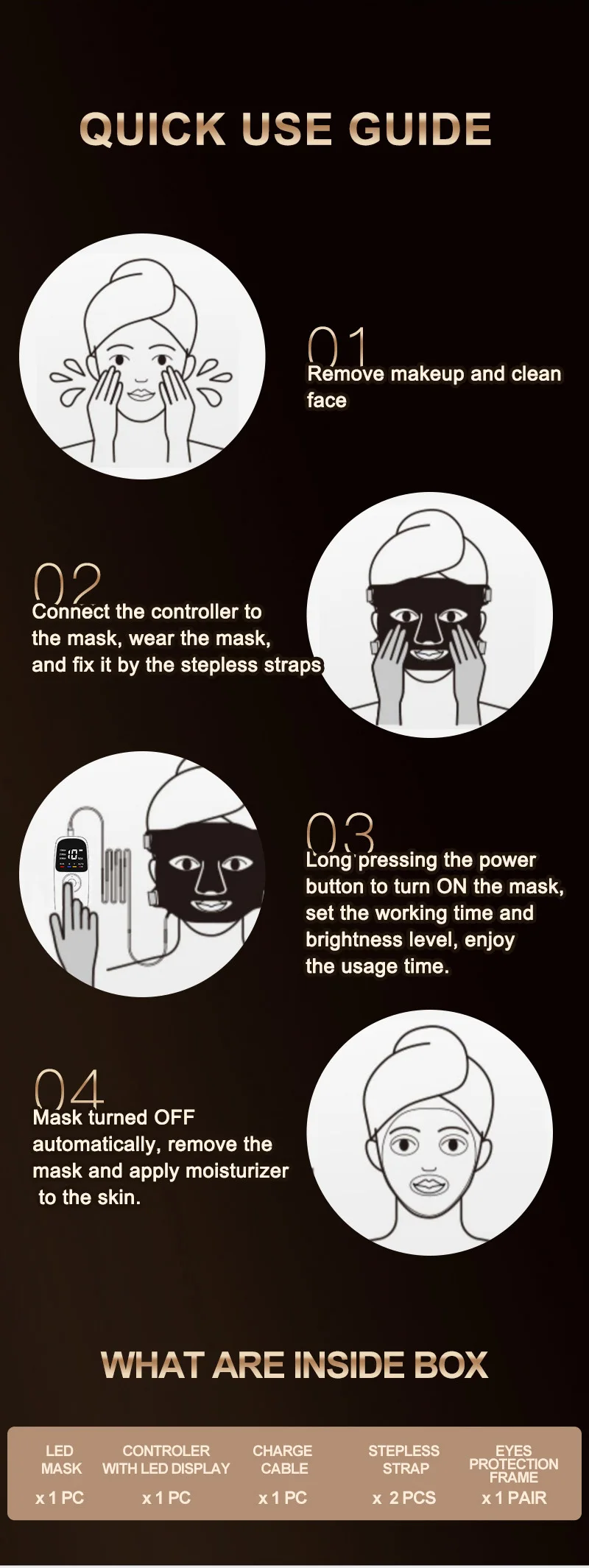 1.Salon-Level Skin Care and Treatment: Use natural light waves and infrared light,which are transmitted by LEDs into the skin. Solve stubborn skin problems. Can reduce and prevent wrinkles,prevents moisture-loss, minimizes pores, helps fight fatty areas.Repair skin,allowing you to regain white, firming, elastic and youthful skin